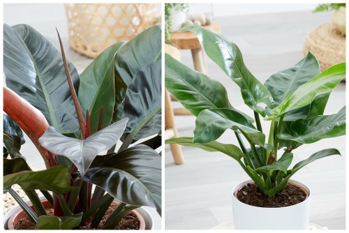 Филодендрон краснеющий насчитывает 25 гибридов, выведенных селекционным путём. Сорт «Burgundy» (Бургундия) – №1 в перечне наиболее эффектных представителей семейства. Выразительный красноватый окрас листьев и ствола, сердцевидная форма листовой пластины и его ярко выраженная глянцевая поверхность заслуженно пользуются славой универсального элемента декора.