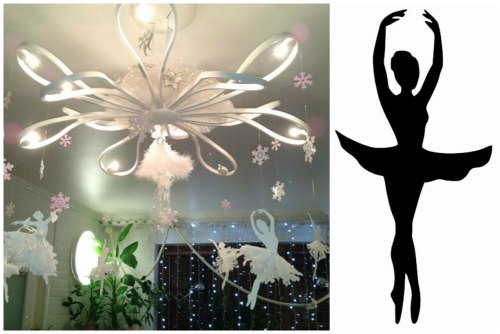 Если вы читали нашу статью: «Как сделать снежинки на Новый год», то наверняка обратили внимание на изящные новогодние поделки в виде силуэтов балерин в юбочке из снежинки. Тема новогоднего дизайна для потолка без этих прелестных силуэтов будет просто неполной! Вырезанные из тонкой декоративной бумаги, балерины кружатся под воздействием малейшего движения воздуха, создавая неповторимый праздничный фон.