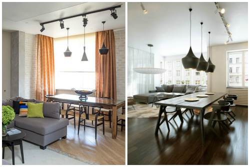 - Остановите выбор именно на подвесных потолочных прожекторах, а не на бра и напольных торшерах. Висящие люстры не займут много места и прекрасно смотрятся. Альтернатива- светодиодные модели.