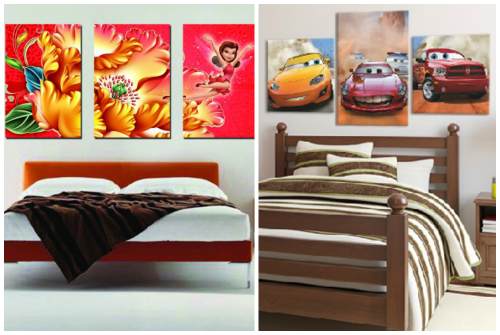 - Спальня. Для декорирования стен этого уютного и укромного местечка, следует помнить, что это комната для уединения и расслабления. Именно поэтому в изображениях не следует выбирать агрессивных или резких линий, ярких цветов. Для спальни больше всего подойдет приглушенный, спокойный пейзаж или красивое абстрактное изображение, которое обязательно должно гармонировать с остальной отделкой комнаты отдыха, так как резкий резонанс будет привлекать все внимание только к настенному элементу интерьера.