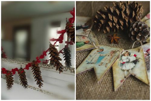 В ход идут бумажные ажурные салфетки и крафтовая бумага, соединенные с вязанным декором, сосновыми и еловыми шишками, веточками, игрушками, бусинками – в общем, со всем, на что хватит фантазии и ресурсов.