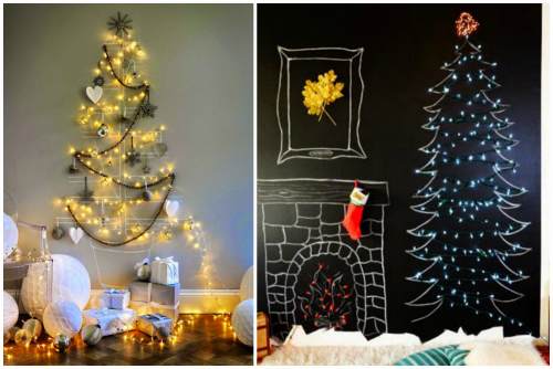 Что же проще – просто нарисовать ёлку на стене. Такая декорация не занимает места и легко убирается после праздников. Её можно украсить гирляндой.